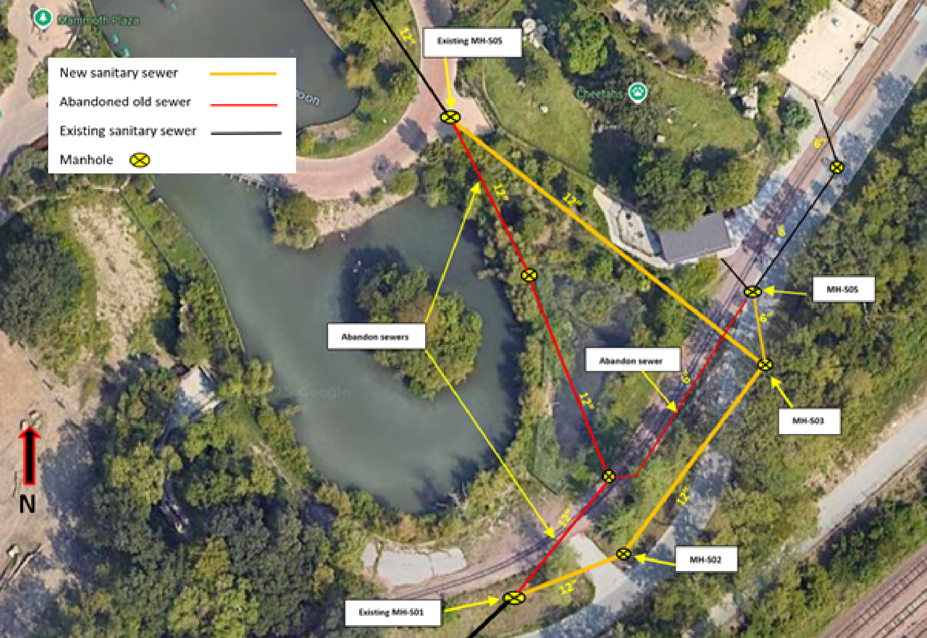 Through periodic inspections, the City of Omaha has discovered significant sewer repairs needed on a public sanitary sewer that runs through the Omaha Henry Doorly Zoo & Aquarium. There is a 12in vitrified clay pipe by the Cheetah house and lagoon that has two pipes with significant breaks. The sanitary sewer will be rerouted because train tracks and lagoon would be greatly compromised. The damaged 12-inch sewer will be plugged and filled with flowable fill. This project will be in two phases with the first phase to start in September 2025.